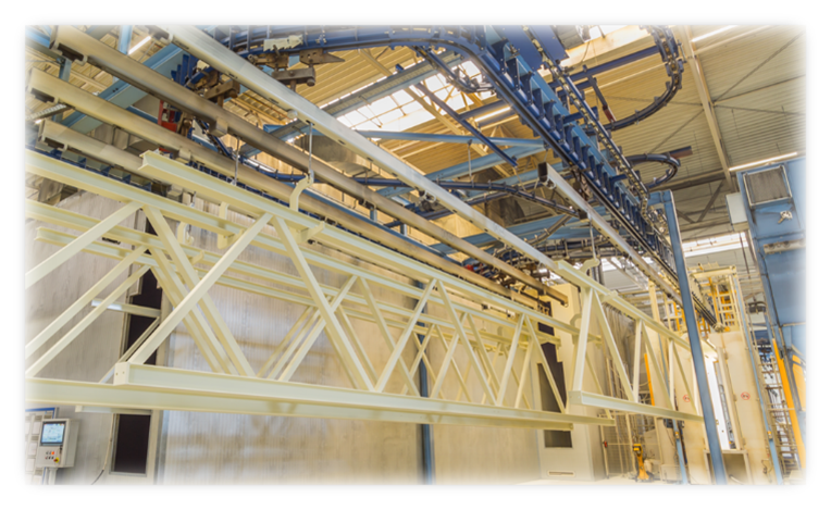 GOLDBECK Elementy Polska fabricates load-bearing structural steel components and applies powder-coat finishes according to project specifications. Typical production flow includes: order intake and detailing (BIM/CAD), cutting and profiling (saw, plasma/laser), drilling and machining, assembly and welding per qualified WPS, dimensional inspection, surface preparation (shot-blasting), application of powder-coat systems designed per EN ISO 12944 (dry-film thickness and durability category per project), curing, final QC (DFT/adhesion), picking and dispatch to site. Components are delivered as e.g. trusses, beams, columns, braces and accessories ready for installation.