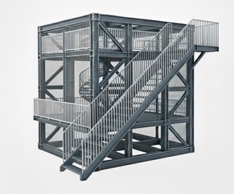 Prefabricated unit for industrial and commercial use. Made of high-strength metal. The construction is durable, easy to assemble, and flexible for use in observation, access, or support functions. Consists of from simple steel sheet cuts to complex assemblies. Products are mostly painted and some parts are galvanized. Result are weighted average of painted and galvanized products. Volumetric mass density 1154.3 kg/m3.