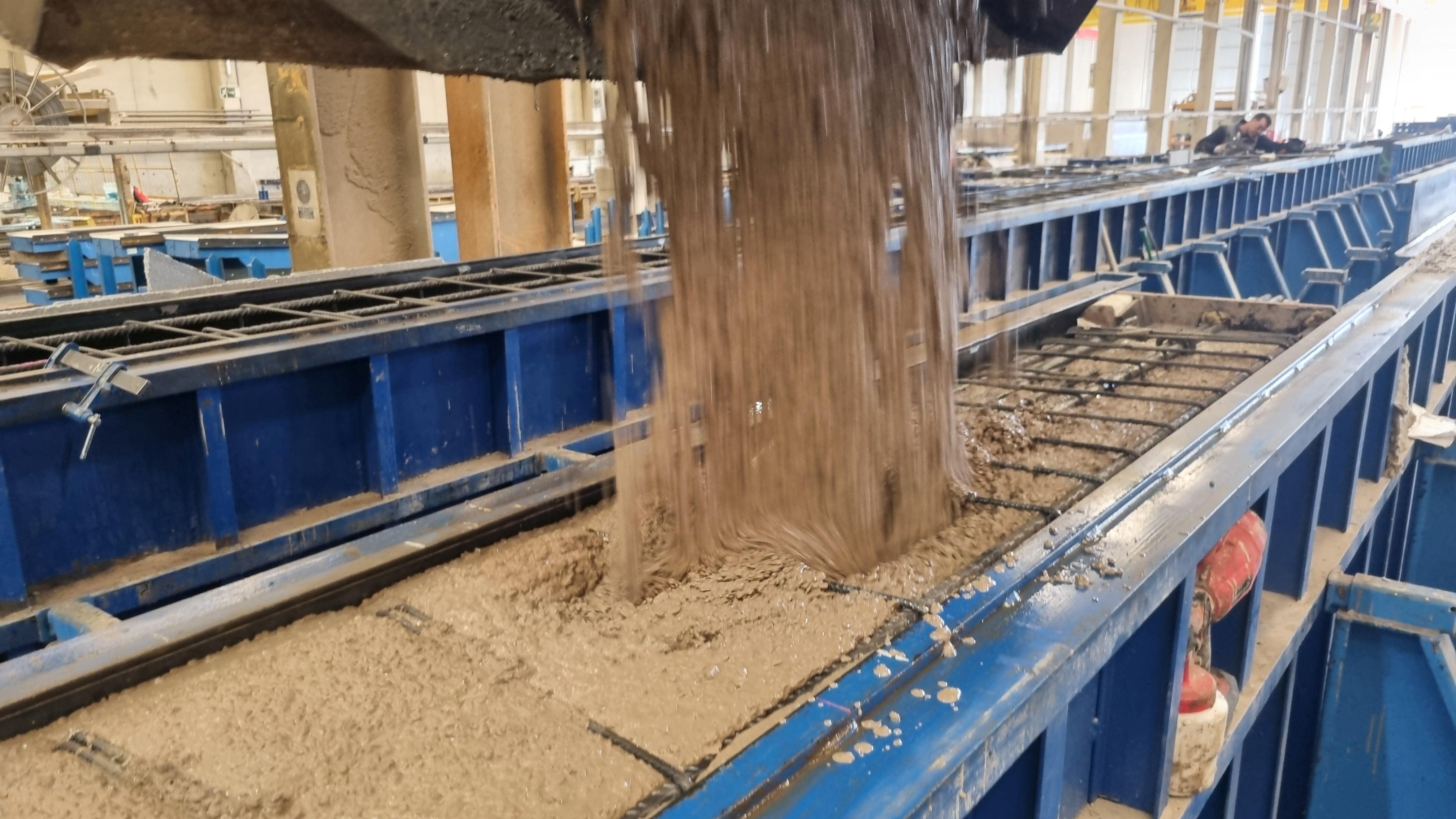 Precast concrete is a product in its fresh state, being a mixture of aggregates, cement, water and additives, dosed and mixed in a concrete manufacturing plant at the La Puebla de Híjar factory.