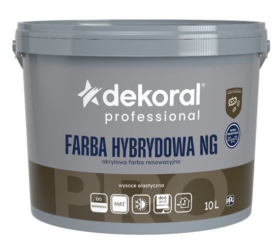 Dekoral Professional Farba Hybrydowa NG is a flexible renovation paint based on a combination of polymer binders; designed for decorative and protective painting of building facades and interiors.