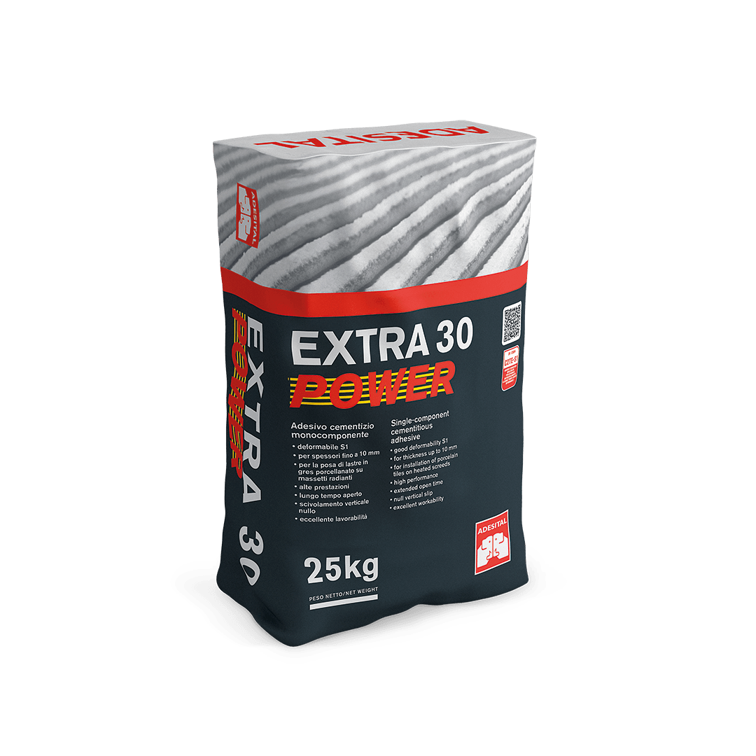 Extra 30 Power grigio is a single-component, highly performing, cementitious, S1 deformable adhesive. Studied for installing large porcelain stoneware slabs.