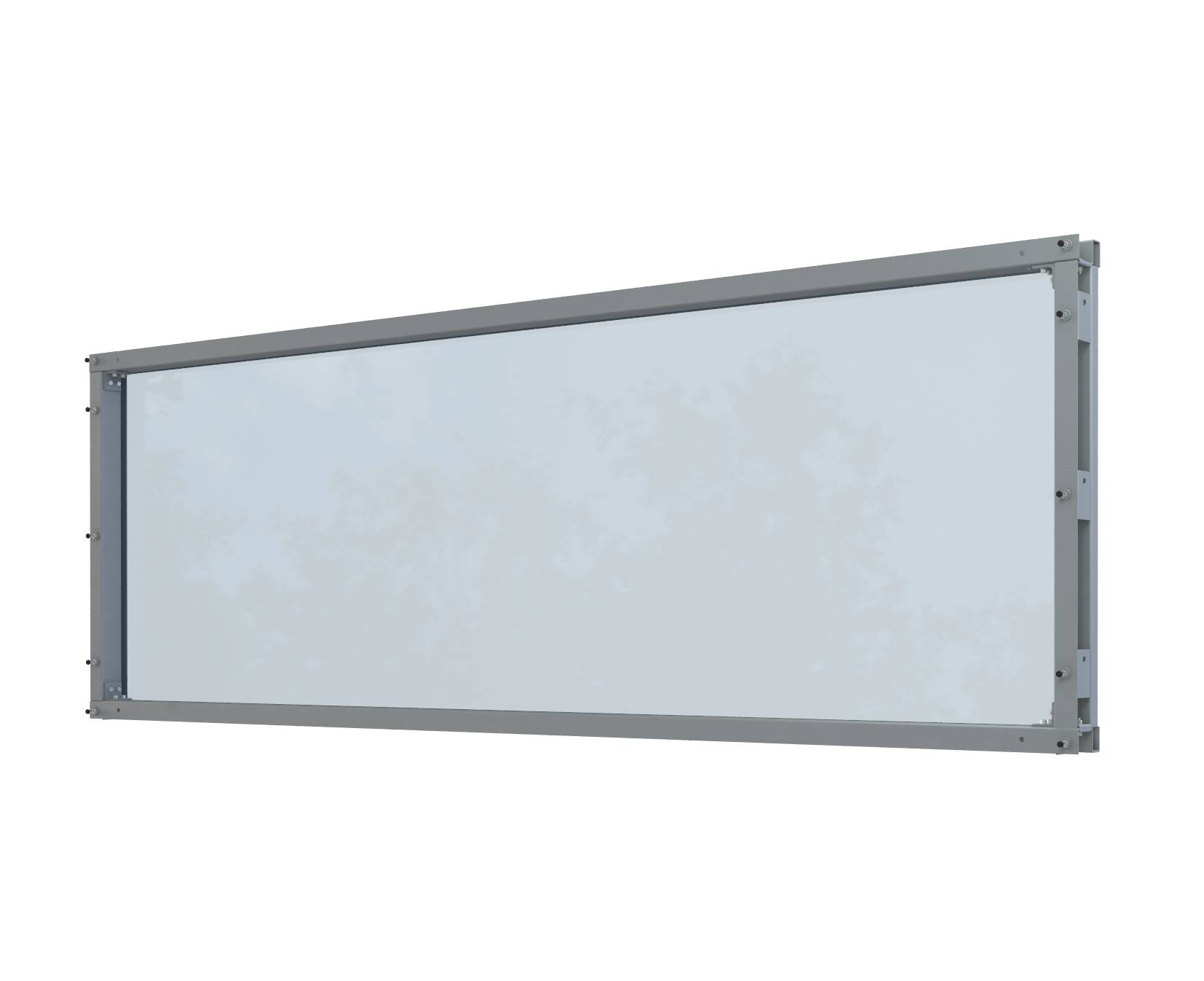 Transparent panel made of laminated tempered glass with a hot-dip galvanized and painted steel frame, used for noise reduction along railway lines. Since this is a product approved by the Italian Railways (RFI), the dimensions and characteristics of the materials cannot be changed. 3x2 m and 3x1 m variants.