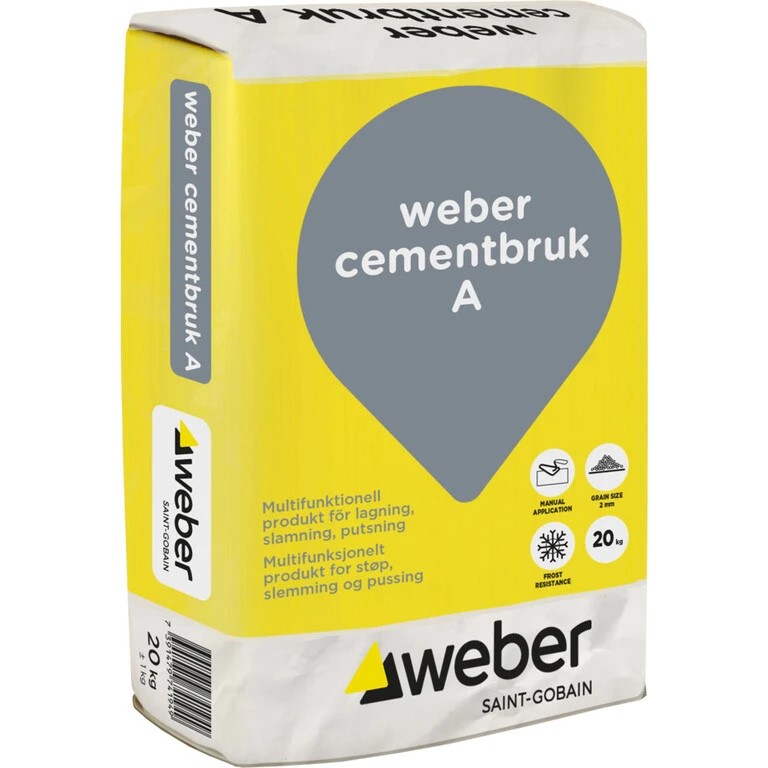 Cementbruk A 0-2mm is a dry mortar. Mix only with water to obtain a ready-to-use mortar for plastering and repairing and is also suitable as a priming mortar, slurry mortar on foundation walls below ground and can be combined with additives without side effects, e.g. with Weber Water-proofing to obtain a denser plaster mortar. Cementbruk A meets the requirements of AMA hus for mortar type A. Cement mortar A is adapted for hand application.