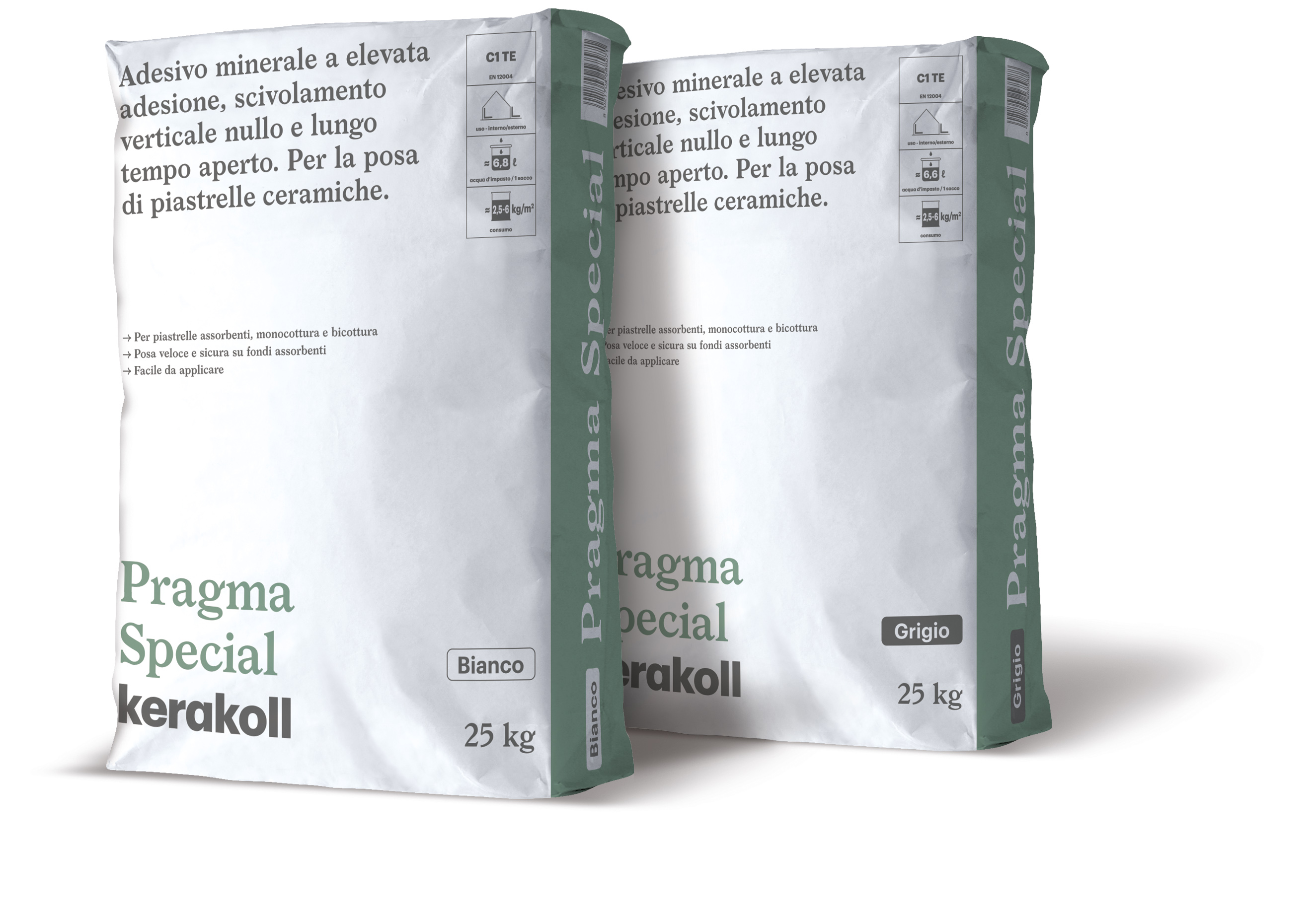 Pragma Special is a high-adhesion mineral adhesive with zero vertical slip and extended open time, designed for the installation of ceramic tiles.