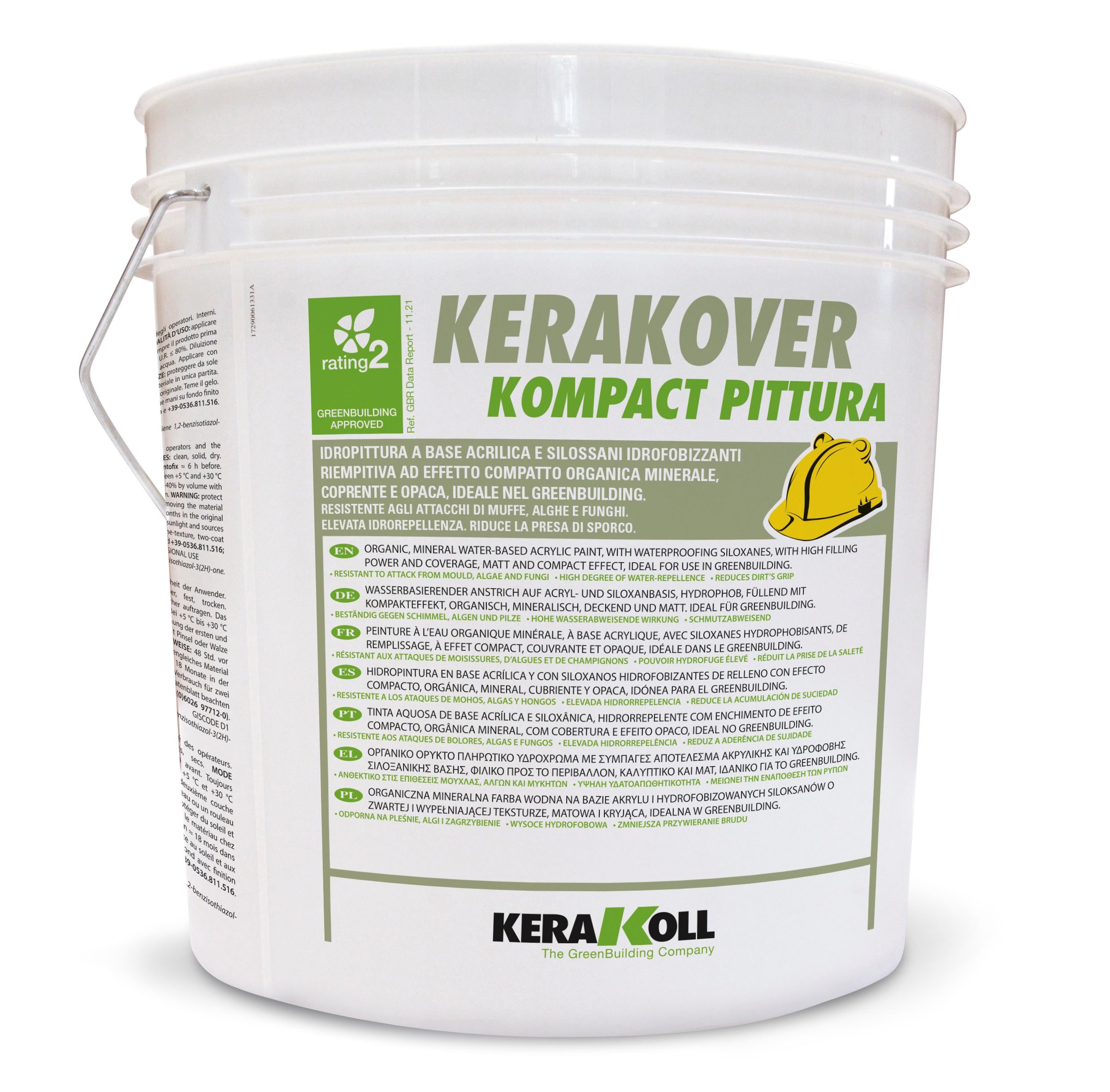 Kerakover Kompact Pittura is an acrylic water-based paint with hydrophobic siloxanes, featuring a compact effect, organic-mineral composition, high covering capacity, and a matt finish.