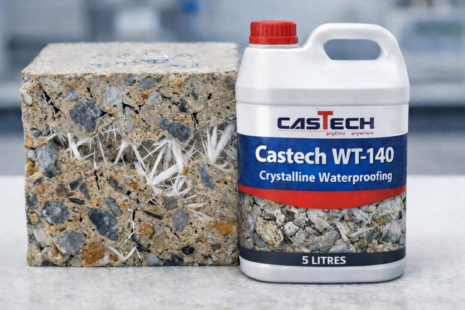 CasTech crystalline waterproofing products are supplied as liquid additives and are incorporated directly into concrete or cementitious mixes during production.