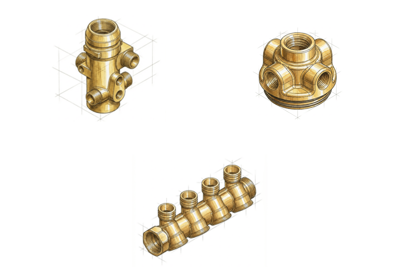 The components are intended for multiple application sectors, including plumbing and heating systems, hydraulic and mechanical installations, automotive, energy, medical applications, and general industrial uses. Key functionalities include fluid conveyance and regulation, mechanical connection and joining, structural support, and integration into complex assemblies requiring dimensional precision, mechanical strength, and long-term reliability.