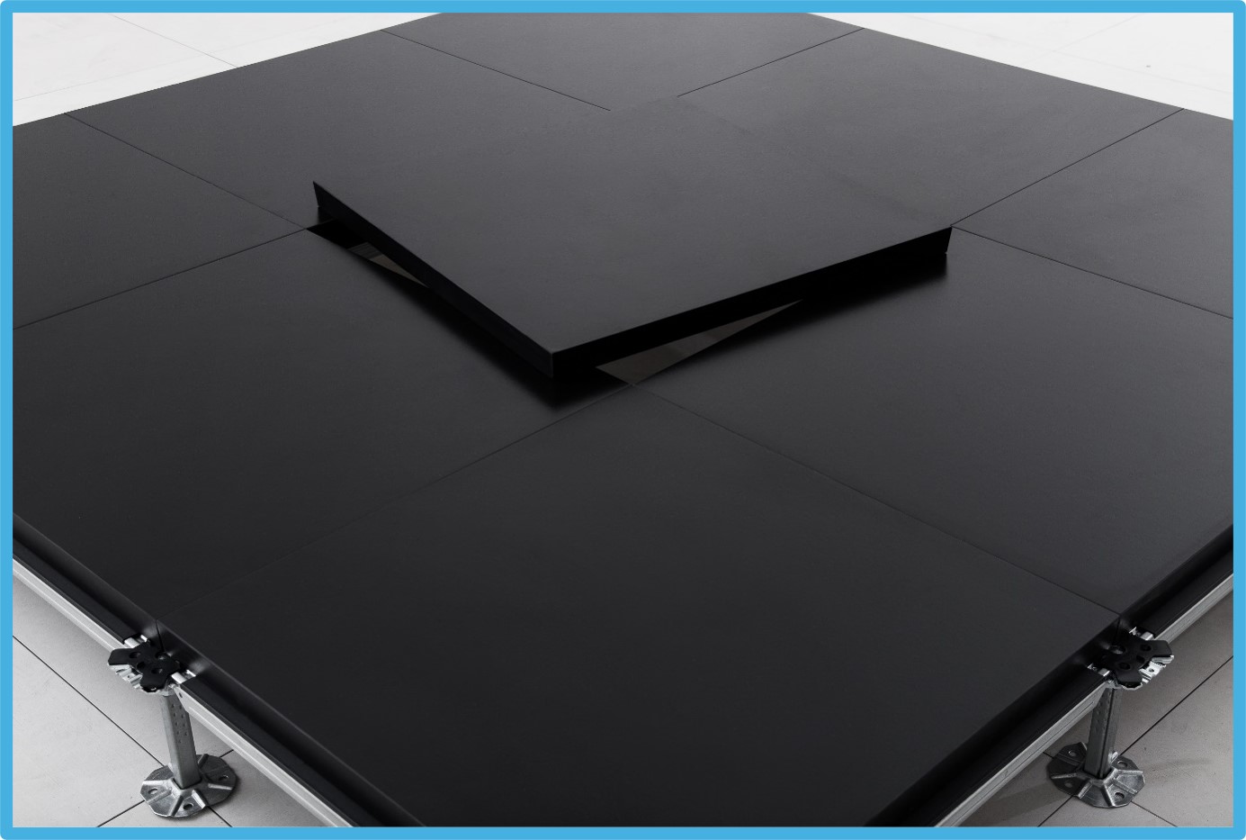 Raised access floors composed of a core made of high-density (1500 kg/m³) calcium sulphate reinforced with organic cellulose fibers, ensuring excellent load-bearing capacity. The bottom layer feature an aluminum foil layer as a vapor barrier. The top surface is finished with rubber. Each panel is precision-cut and edged with PVC borders.