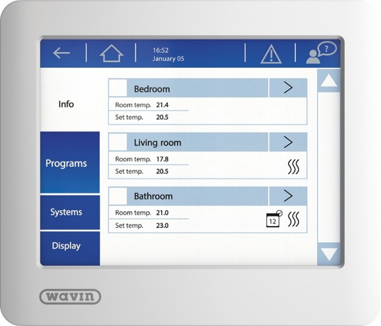 The Wavin Sentio Commissioning Touch Screen allows access to all system functions and settings, including time scheduling, custom temperature profiles, holiday and standby modes. The system settings are stored in the memory of the Central Control Unit, so one screen could be used to change the settings for multiple systems, and would not need to be a permanent fixture.