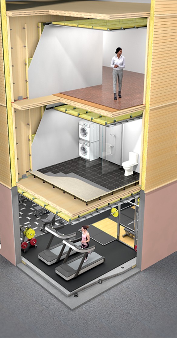 Vibratec offers a broad range of solutions to reduce vibrations and the transmission of structure-borne sound. The range includes ceiling systems and hangers, wall mounts, as well as floor systems and floor mounts. The solutions decouple installations and building elements from the structure for effective vibration isolation.