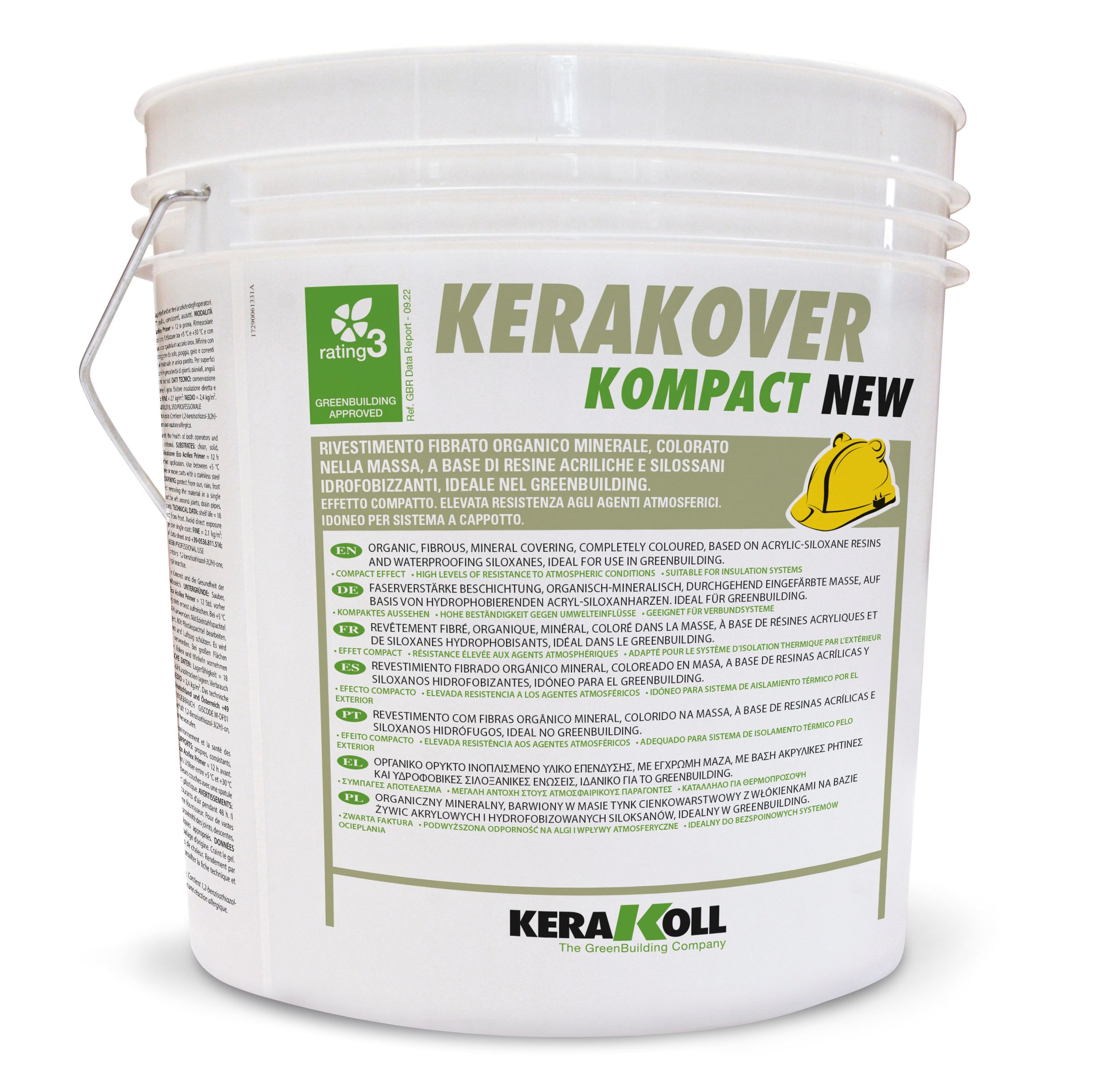 Kerakover Kompact New is a mass-colored, mineral organic fibered coating formulated with water-based acrylic resins and hydrophobic siloxanes. Available in extrafine, fine, and medium granulometries, it provides a thick, highly elastic decorative layer with a closed-surface, compact effect.