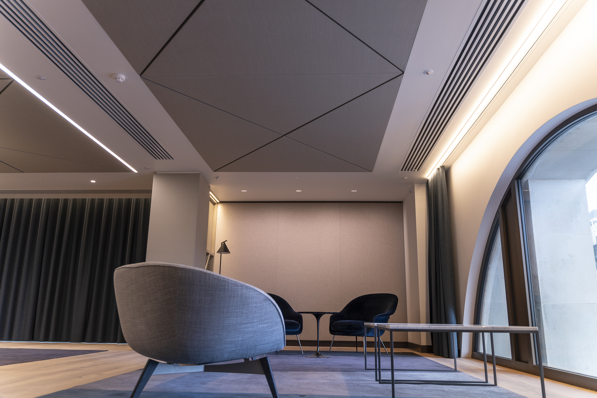 Acoustic Ceiling Panels (Versa-Tile) - is made up of an aluminium extrusion frame with plastic track inserts. The fibreglass insulation is then cut to size and laid within the frame. Finally, the whole panel is covered using the chosen fabric, it is stretched across the face of the panel wrapped around the aluminium frame and tucked into the plastic track at the back of the panel. The panel is then installed using a wire suspension system, hinge and push latch or magnets dependant on what is feasible and the clients required finish.