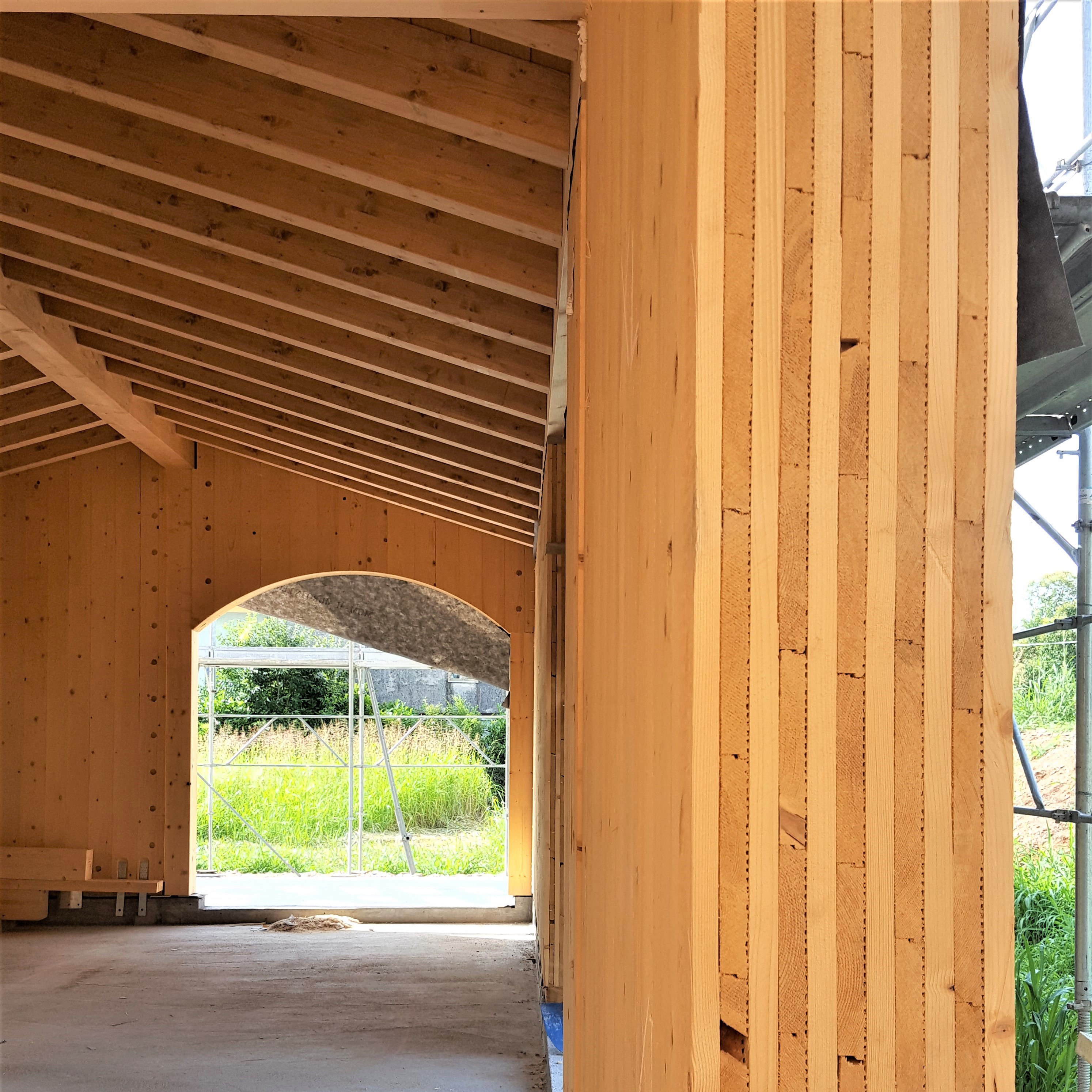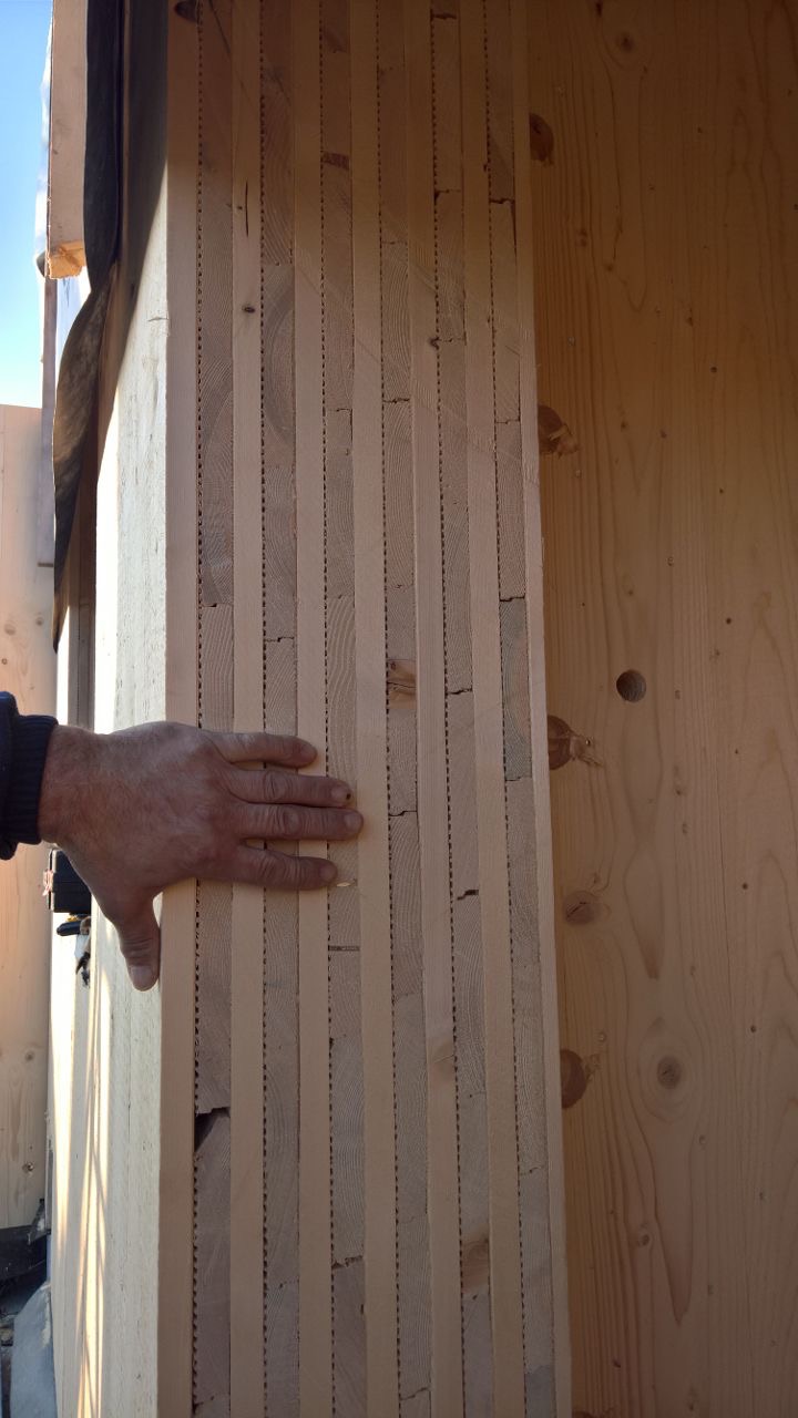 Pannello MHM: IL MURO IN LEGNO MASSICCIO senza colle e sostanze chimiche è costituito interamente da tavole di legno a strati incrociati, non trattate, fissate da chiodi in alluminio grippati. Rivestite internamente con cartongesso ed esternamente con cappotto ed intonaco, con materiali naturali.