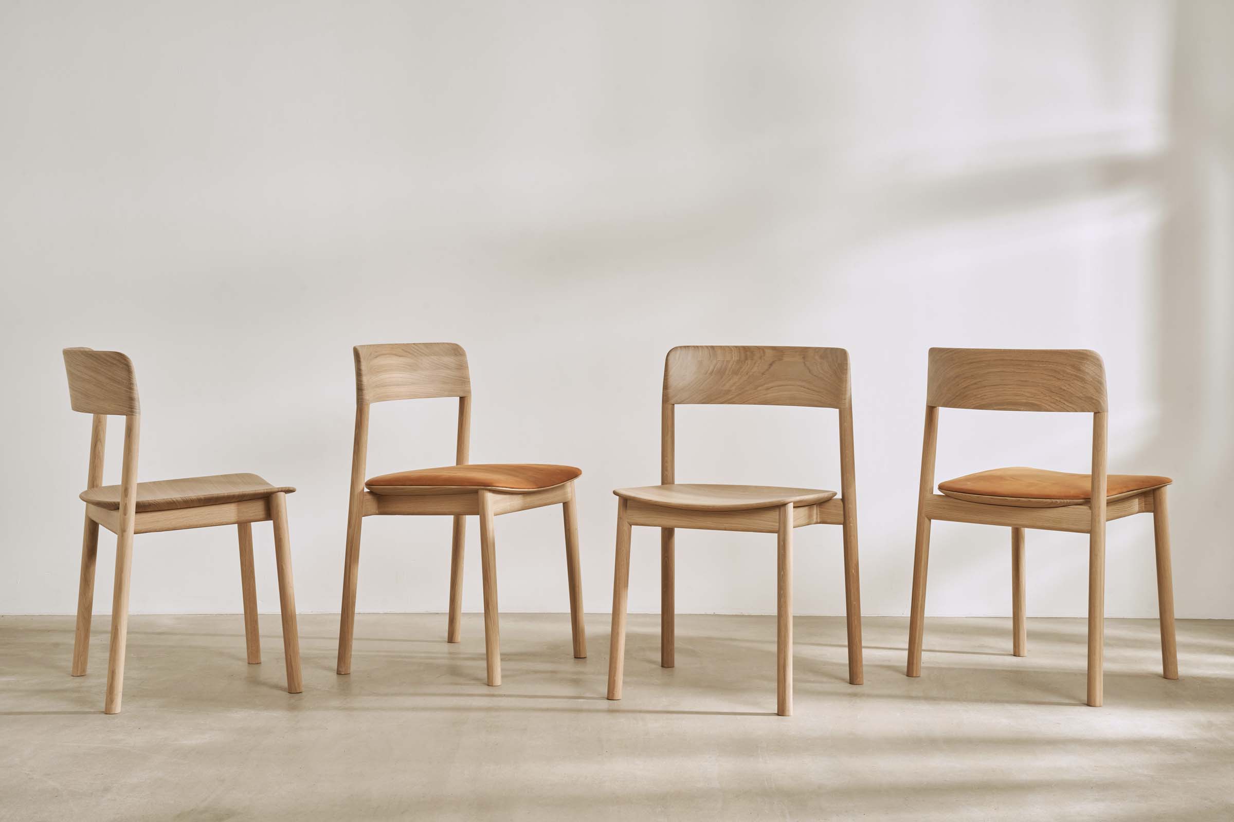 A solid timber and leather upholstered stackable side chair designed by Foster + Partners. Made in solid oak, ebonised oak and walnut with an oiled finish. The upholstered seat has an organic sheep wool filling from the UK chrome free leather upholstery from Europe.