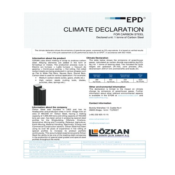 Özkan Steel was founded in 1953 and has its headquarter and production sites in İzmir-Aliağa over an area of 460,000 m². Özkan Steel, having a melting capacity of 1,000,000 tons and rolling capacity of 700,000 tons per year, has been active in producing special steel profiles for the Shipbuilding, Offshore, Onshore, Automotive, Mining and Tunneling, Railways, Agriculture, Earth Moving, Material Handling, Machinery, Energy and Commercial Construction sectors.