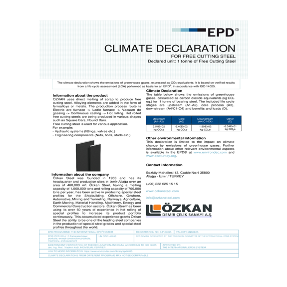 Özkan Steel was founded in 1953 and has its headquarter and production sites in İzmir-Aliağa over an area of 460,000 m². Özkan Steel, having a melting capacity of 1,000,000 tons and rolling capacity of 700,000 tons per year, has been active in producing special steel profiles for the Shipbuilding, Offshore, Onshore, Automotive, Mining and Tunneling, Railways, Agriculture, Earth Moving, Material Handling, Machinery, Energy and Commercial Construction sectors.