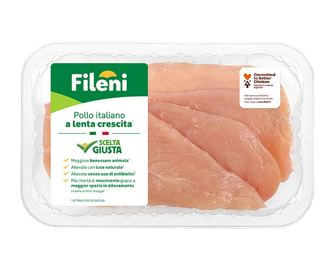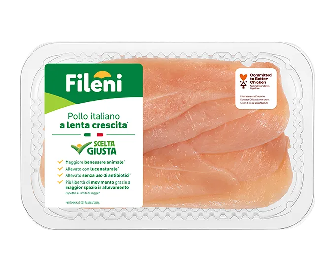 Object of the EPD is Fileni GMO-free chicken breast (sliced, half and whole breast) packaged in different ways. One above all, sliced chicken breast, is packed in compostable trays, introduced in 2020. Both tray and wrapping film are made of bioplastic and they can be both disposed along with organic waste.