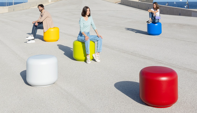 The product is a basic, mobile and versatile bench made of high-density polyethylene. It has an area of Ø60 x 52 cm and weights 11 kg. Its intended use is for sitting informally around a table or to use it as an occasional seat in waiting areas. It can also be used in groupings of several elements to generate interpersonal relationships or as a seat in children's recreational play spaces.