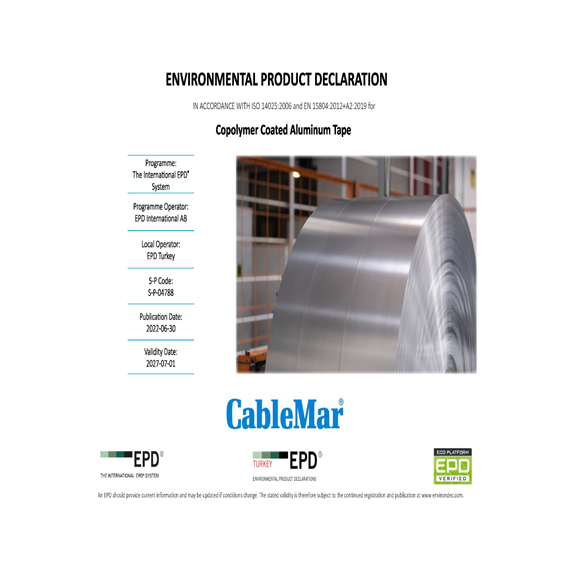Kablomar carries out the production of copolymer coated aluminum tape in three processes. First, the mono-extrusion film production machine is filled with a raw materials mixture of EAA and other chemical supportive additives in certain proportions. The mixture is melted at approximately 150-160 degrees and the copolymer film became suitable for the desired coating color, width, thickness, and quantity. The copolymer film and the bare aluminum foil are loaded into the coating machine in a single/double-side in accordance with the customer's request. Before the oven, the loaded materials are bound to each other by the pre-lamination process in the coating machine, and they are passed through a five-meter-long tunnel oven at certain speeds with a temperature of approximately 200-300 degrees. The bare aluminum foil and the copolymer film pass through the coating line and becomes completely adhered to each other with the help of temperature (HEAT). In this way, the copolymer-coated aluminum product, which is the main product, becomes ready for slitting. In the third process, the fully automatic double shafts slitting machine is fixed according to the desired ID (inner diameter), width, and length then finally the production of copolymer-coated aluminum tape is completed by slitting the master roll into tapes. Finally, the tapes are packed in accordance with the customer’s specification and became ready for shipment. The aluminum used in the product comes mostly from Asia and Russia.