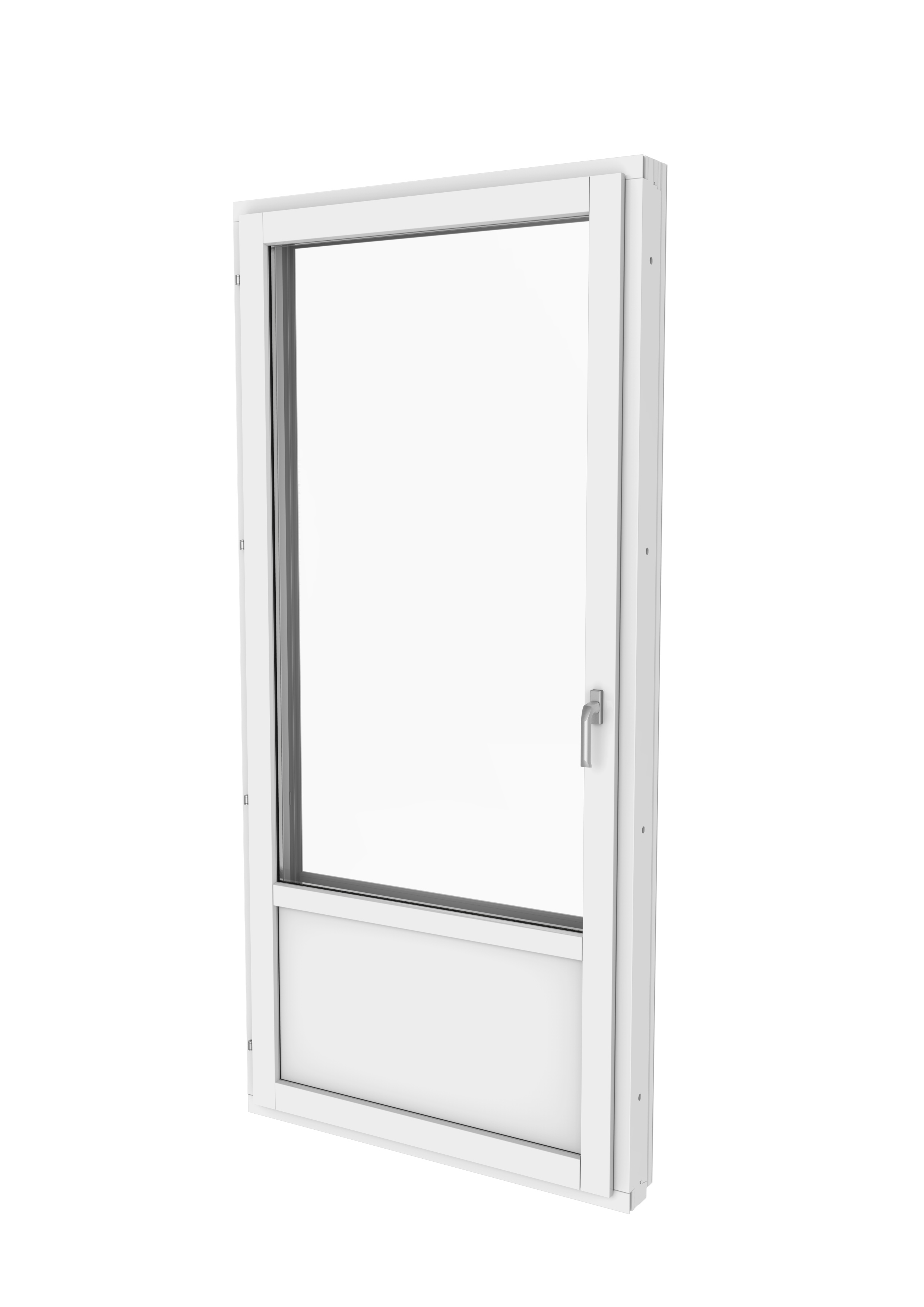Elitfönster Harmoni Balcony door 2+1 is a side-hung balcony door that opens inwards. The casement consists of two connected sashes. The inner casement consists of wood with a mounted insulating glass with two glasses and a filling. The outer casement is made of aluminum with a simple float glass and filling. The casement is attached to the frame via bolt hinges on the side piece, which means that when opened, the casement swings inwards in a horizontal position.