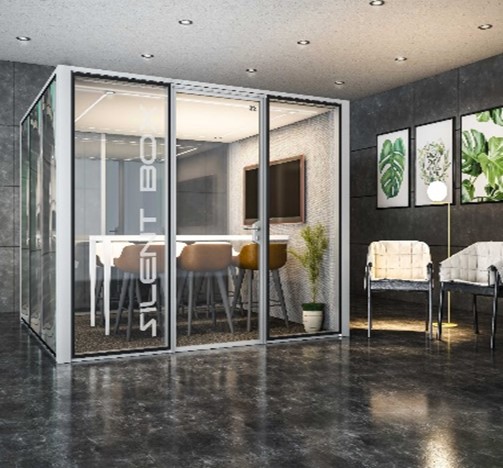Kubik Silent Box available as "Silent Box 1.2 x 1.2", "Silent Box 2.5 x 2.5" & "Silent Box 3 x 3" provides a comfortable, sound-proof space for confidential phone call, private video conference, or just take a minute to quietly collect your thoughts still exist and rejuvenate or silent retreat for uninterrupted work. Kubik phone booth has no base & stands directly on the floor of your office, making it safe, quick to install and easy to relocate. A versatile, practical & dynamic phone booth that is part & parcel of a new way of conceiving the workspace.The SilentBox offers an acoustic insulation of upto 34 dB according to ASTME 596.