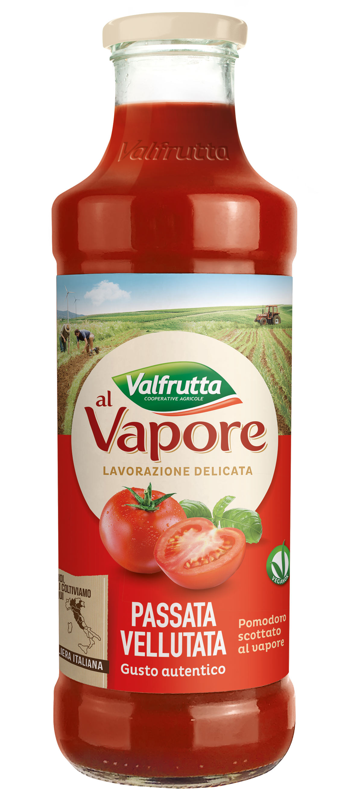 Valfrutta Sieved tomatoes steamed cooked is obtained only from selected tomatoes, using only tomatoes come from certified integrated production, harvested and processed on the same day.