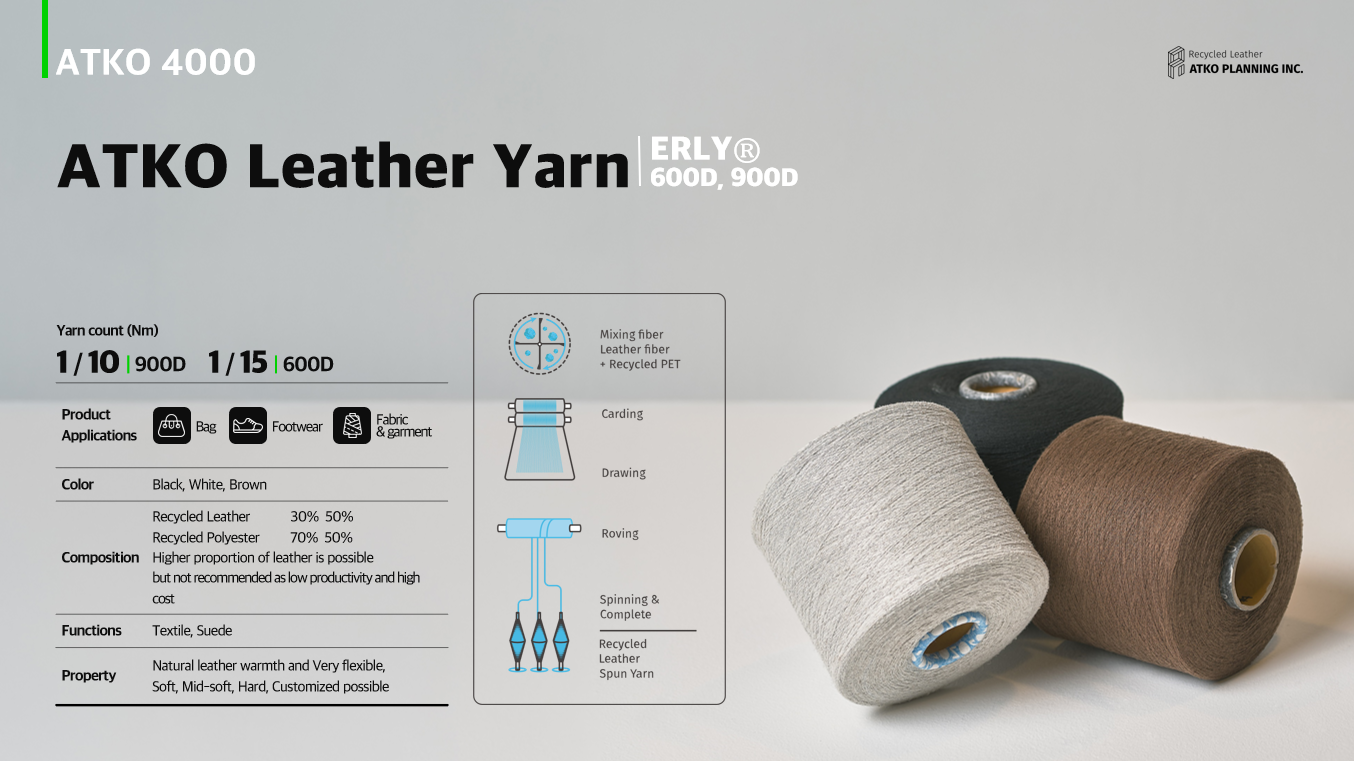 ATKO Planning Inc. invented the world first recycled leather fiber and launched the world first recycled leather spun yarn, ERLY®, using recycled leather fiber andrecycled PET.