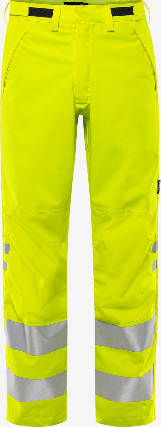 Functional high visibility shell trousers made of soft recycled stretch material. Waterproof, windproof and breathable with taped seams. Comfortable all-weather trousers with zippers along the outside of the legs. Concept: Trofta