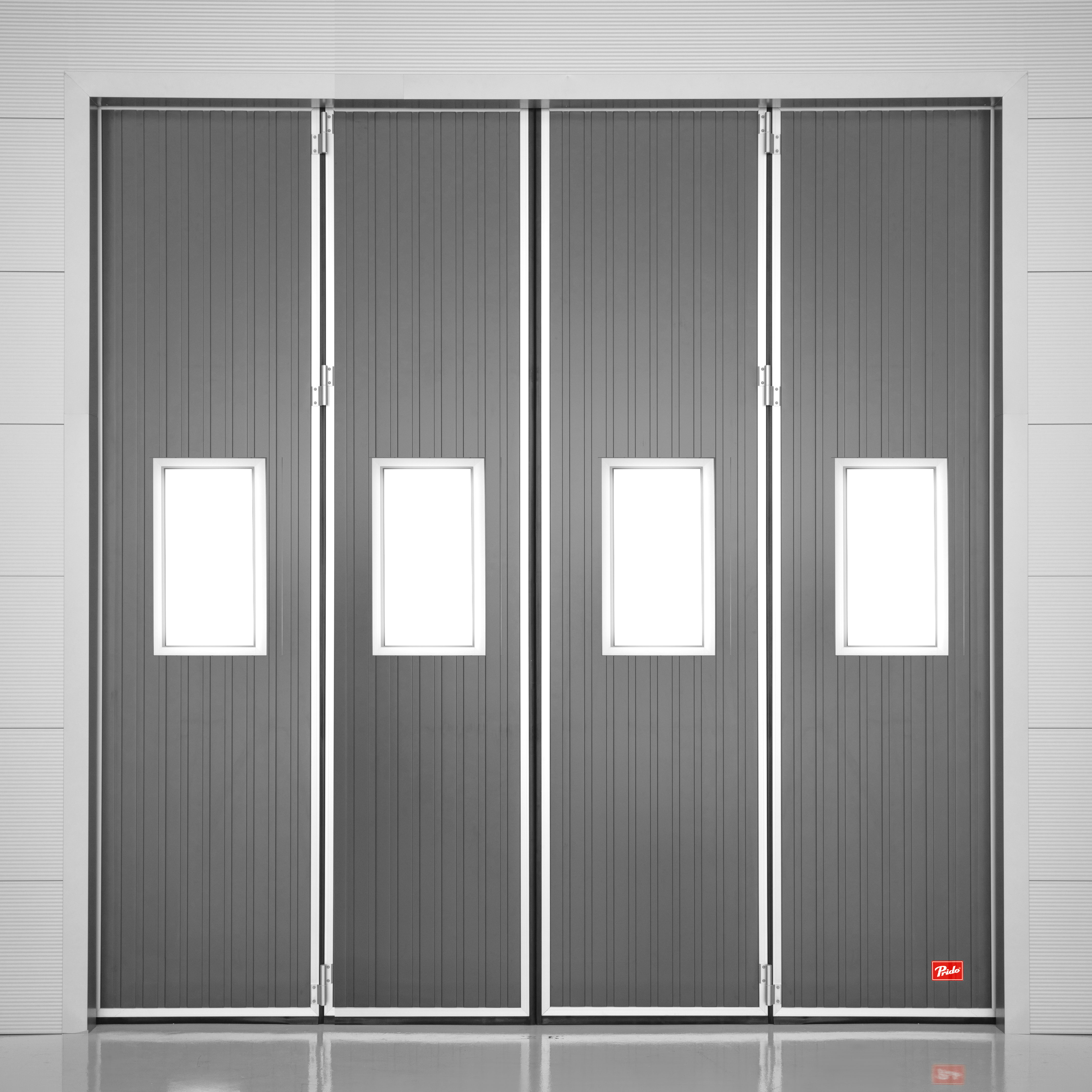 Manually operated folding door consisting of door sections covered in steel sheet, frame of natural anodised aluminium profiles and insulation of polyurethane foam.