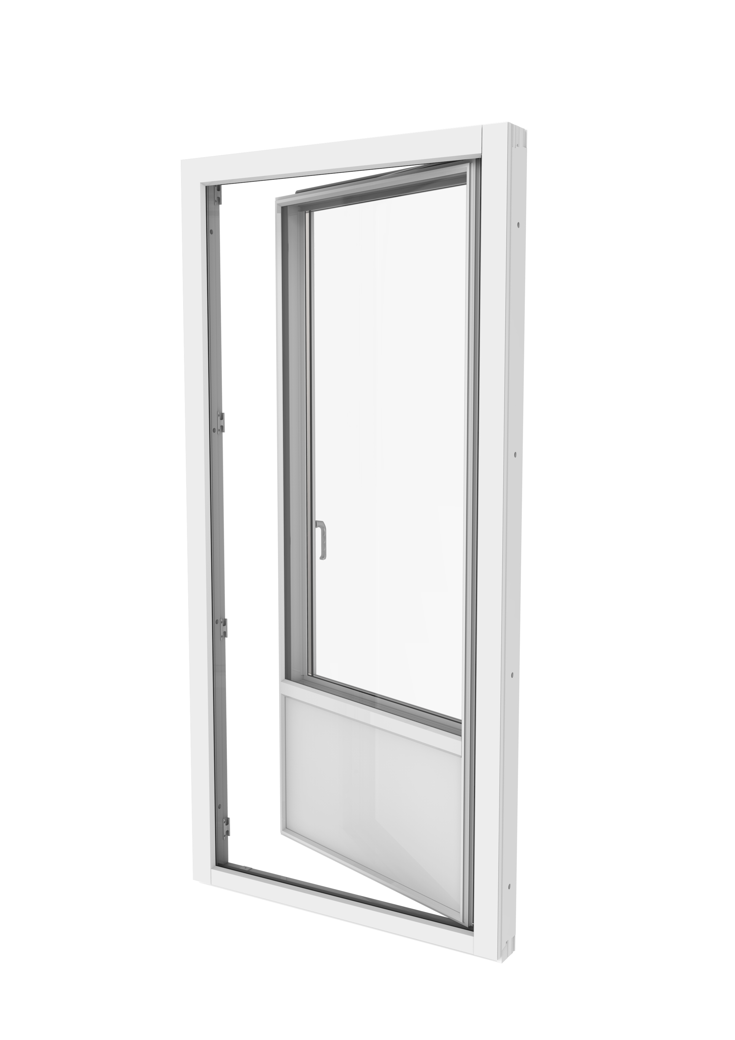 SSC Etri Fönster Balcony door 2+1 is a balcony door with that opens inward. The casement consists of two connected sashes, the inner casement consist of wood with a mounted insulating glass with two glassplanes and a filling, the outer casement is made of aluminum with a simple flas glass and a filling. The casement is attached to the frame via bolt hinges on the side piece, which means that when opened, the casement swings inwards in a horizontal position.
