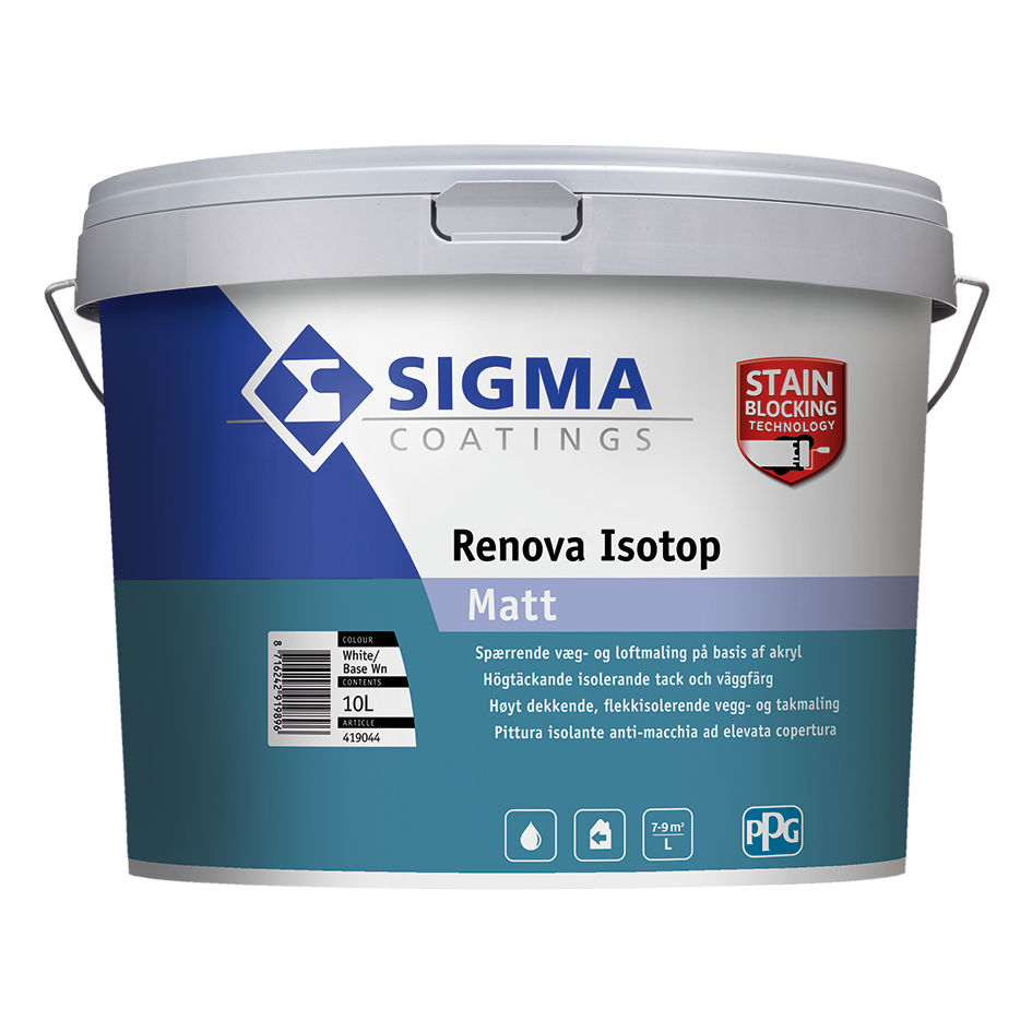 Sigma Renova Isotop Matt is an acrylic-based stain-blocking wall and ceiling paint.
