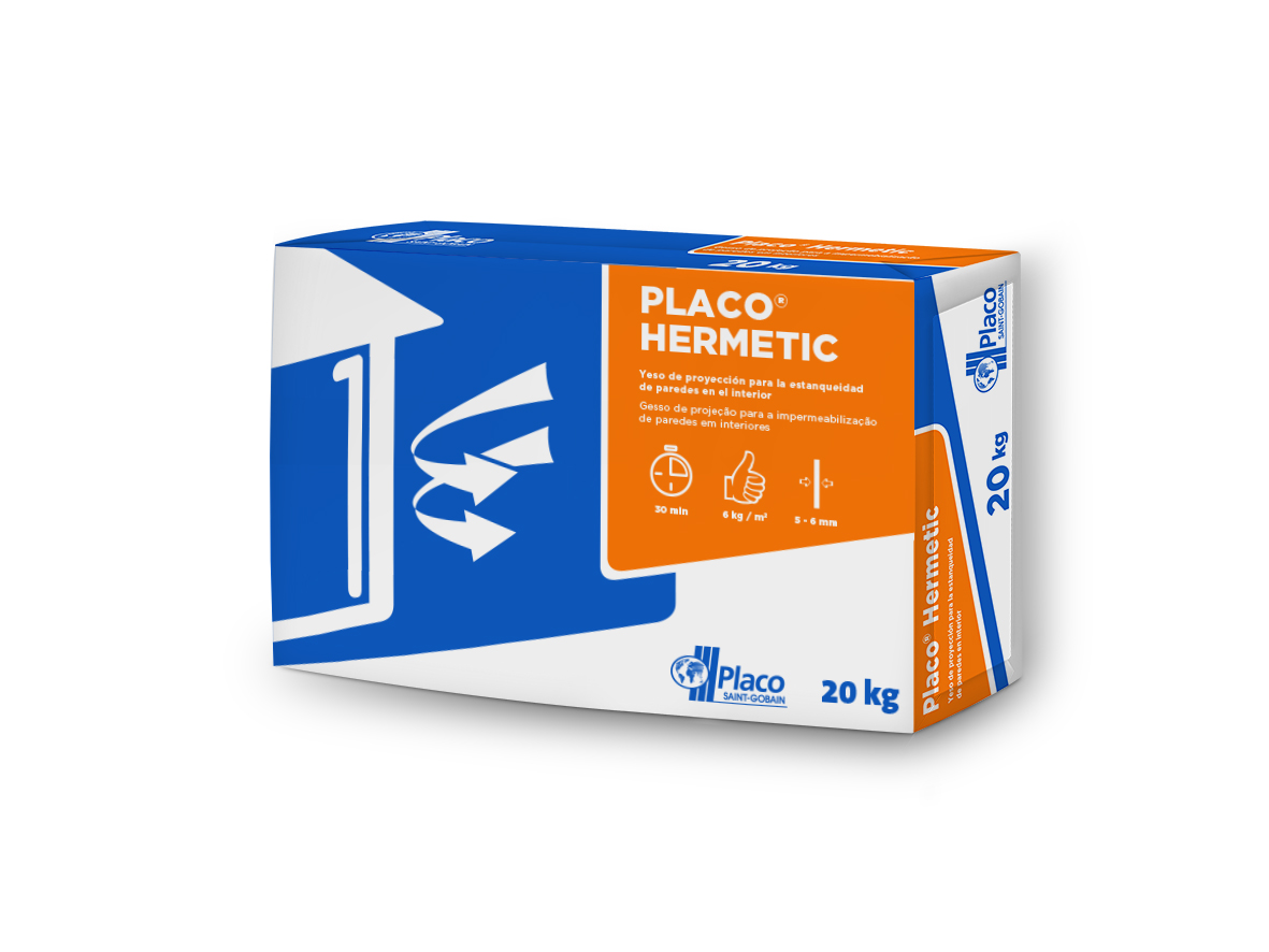 Placo® Hermetic is a projection plaster that is applied as a component of the hermetic system of the envelope of a building with almost zero energy consumption, forming part of the external load-bearing wall of the building. Once applied, it creates a continuous layer that acts as a hermetic membrane to the passage of air, reducing the passage of air and directly influencing the air renewals that a home supports and therefore reflecting in a significant decrease in the energy consumption of the home. Excellent workability and finishing, it can be applied with the same projection machine as a projection plaster. Its special formulation provides high performance. It guarantees hermeticity and the non-appearance of fissures and/or cracks