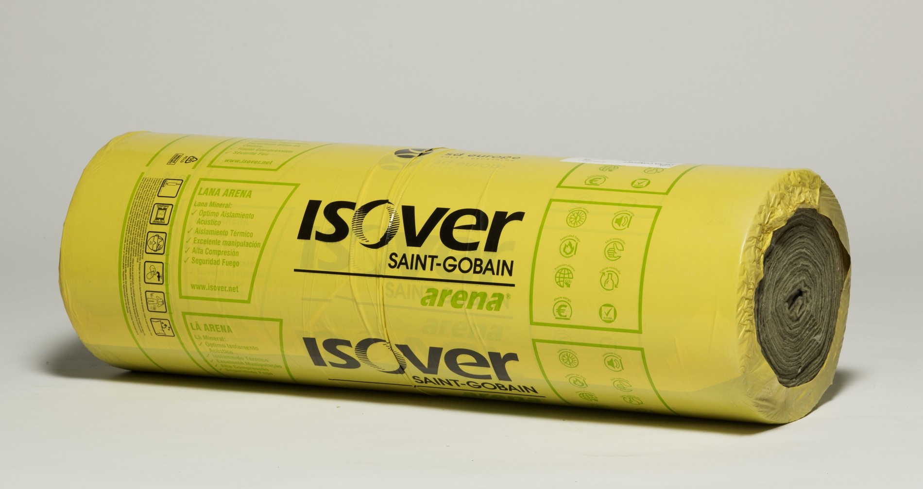 Spanish Rollo de lana mineral Arena, no hidrófilo, revestido en una de sus caras con un tejido de vidrio Neto de gran resistencia mecánica para el aislamiento por el exterior en sistemas de fechada ventilada.