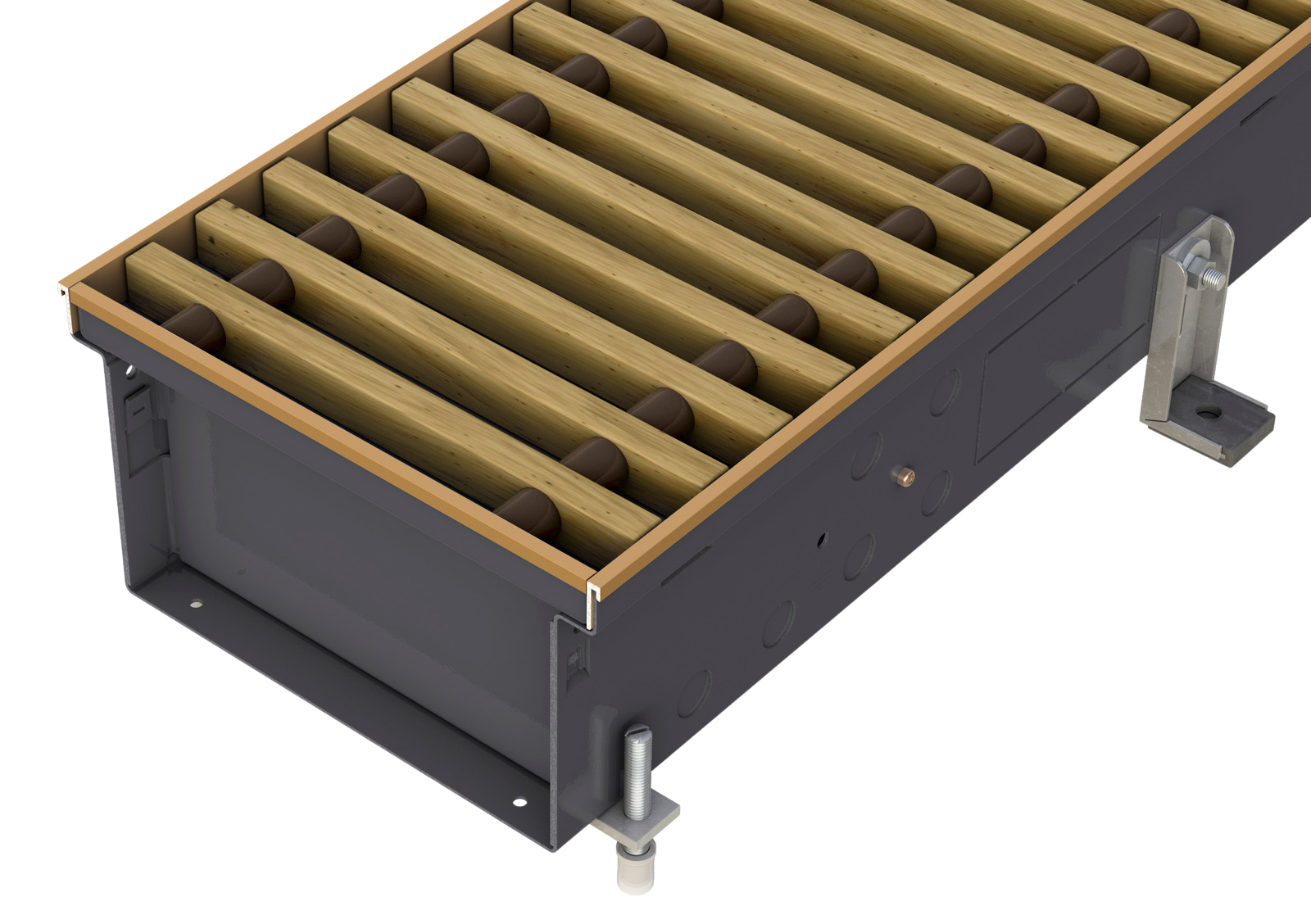 The units are also equipped with an electrotechnical control system to enable the units to be regulated according to the customer’s requirements. The unit components are mounted in a floor trench, which is covered by a roll-up grille or a linear grille. This decorative cover of the trench unit is available in aluminium, brass, stainless steel and wood. The Katherm QK trench unit is used to heat rooms with large window areas. Exemplary areas of application for the unit are hotels, offices, sales and exhibition rooms.