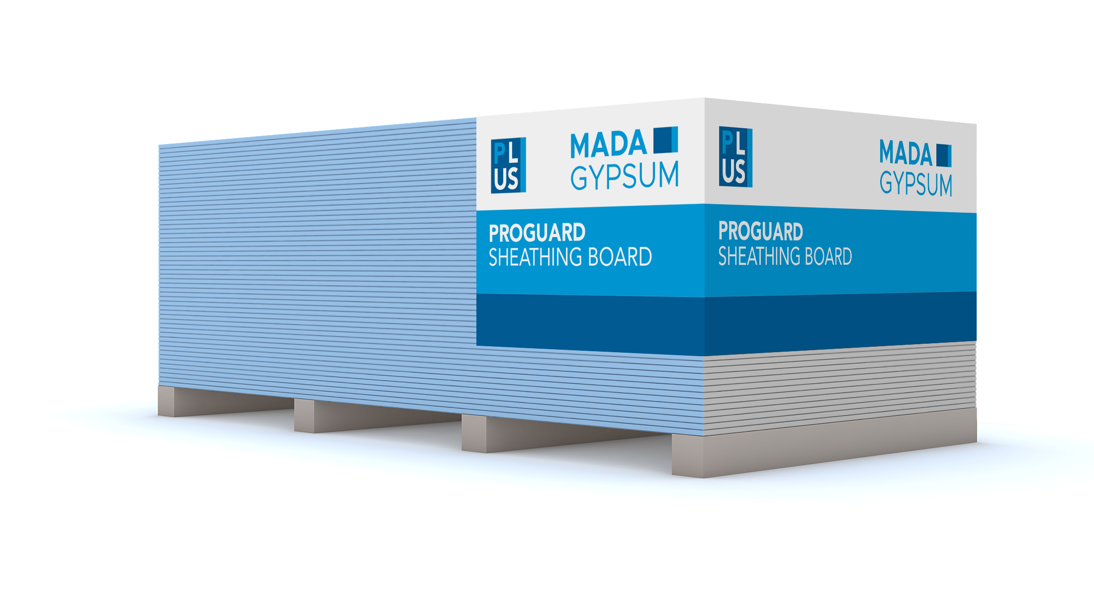 Mada ProGuard glass mat sheathing board is a noncombustible, mold, delamination and moisture-resistant sheathing board that meets the onerous requirements of an external substate. The reinforced core minimizes the potential for warping, buckling, sagging, and rippling, and fire-resistant additives create a noncombustible sheathing board.
