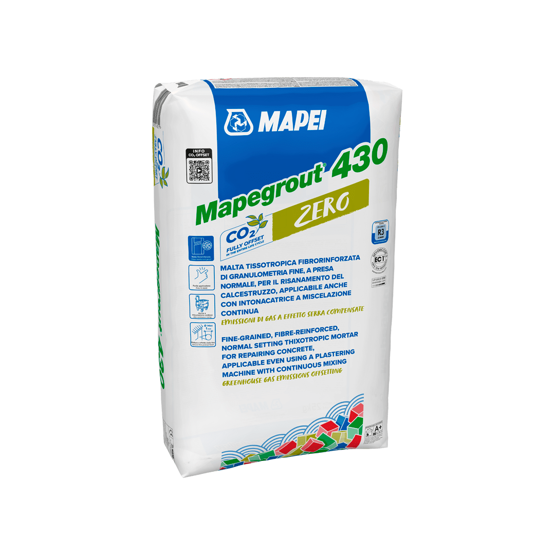 Mapegrout 430 Zero is a pre-blended, compensated-shrinkage mortar in powder form made from cementitious binders, selected fine-grained aggregates, special admixtures, and synthetic fibers according to a formula developed in MAPEI Research & Development laboratories.
