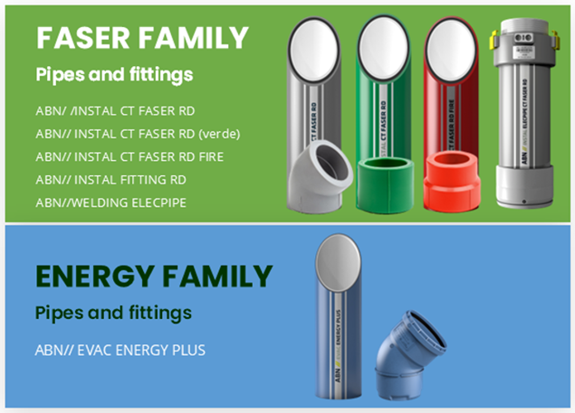 ABN//INSTAL CT FASER RD. Piping system manufactured for different uses: for hydraulic lines at pressure and temperature, recycled water, fire network, etc. Manufactured in three polypropylene PPR CT RP layers, with anti-expansion micro-fibres, antimicrobial protection, resistant to disinfection processes, anti-incrustation protection, ultraviolet UV protection, with reaction to fire classification B-s1, d0, halogen free and 100% recyclable. The family of pipes is completed with two types of accessories: FITTING RD and our new system WELDING ELECPIPE, that saves up to 75% in installation times.