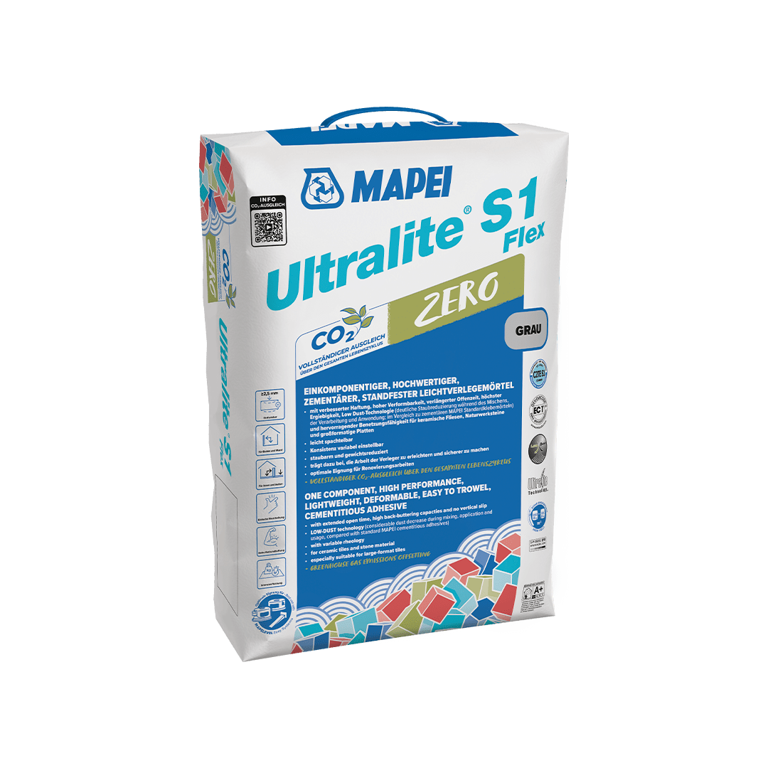 Ultralite S1 Flex Zero is a one-component, high-performance, deformable, lightweight, cementitious adhesive with no vertical slip and extended open time, Low Dust technology and extremely high yield. Easy to apply by trowel with high back-buttering capacities for ceramic and stone tiles. Ideal for large-format tiles. The product is supplied in 25 kg multiply bags.