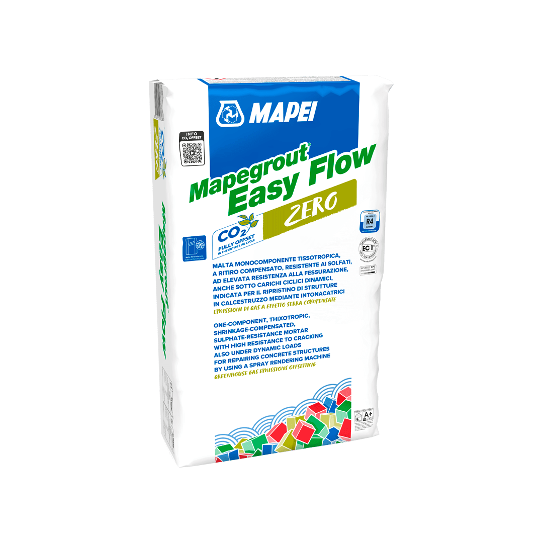 Mapegrout Easy Flow Zero is a one-component pre-blended packed thixotropic cement-based mortar composed of sulphate-resistant hydraulic binders, synthetic polyacrylonitrile fibers, organic corrosion inhibitors, special water-retainers, expansive admixtures, and selected aggregates prepared according to a formula developed in MAPEI Research & Development laboratories.