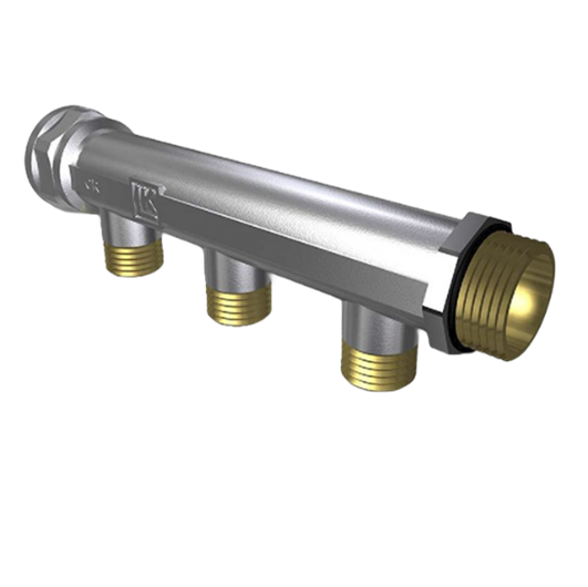 Extension manifold for heating and potable water systems. Attached to the wall in the LK Manifold Bracket, or in LK Manifold Cabinet UNI. Manufactured from dezincification resistant brass, nickel plated.