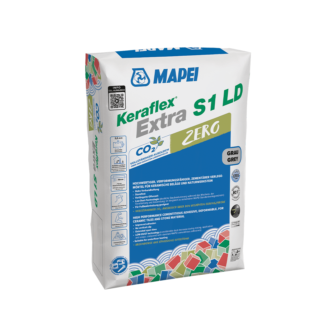 Keraflex Extra S1 LD Zero is a high-performance, deformable cementitious adhesive with variable rheology, with no vertical slip or with high wetting capacity, extended open time, for ceramic tiles and stone material including in large format. The product is supplied in 25 kg multiply bags.