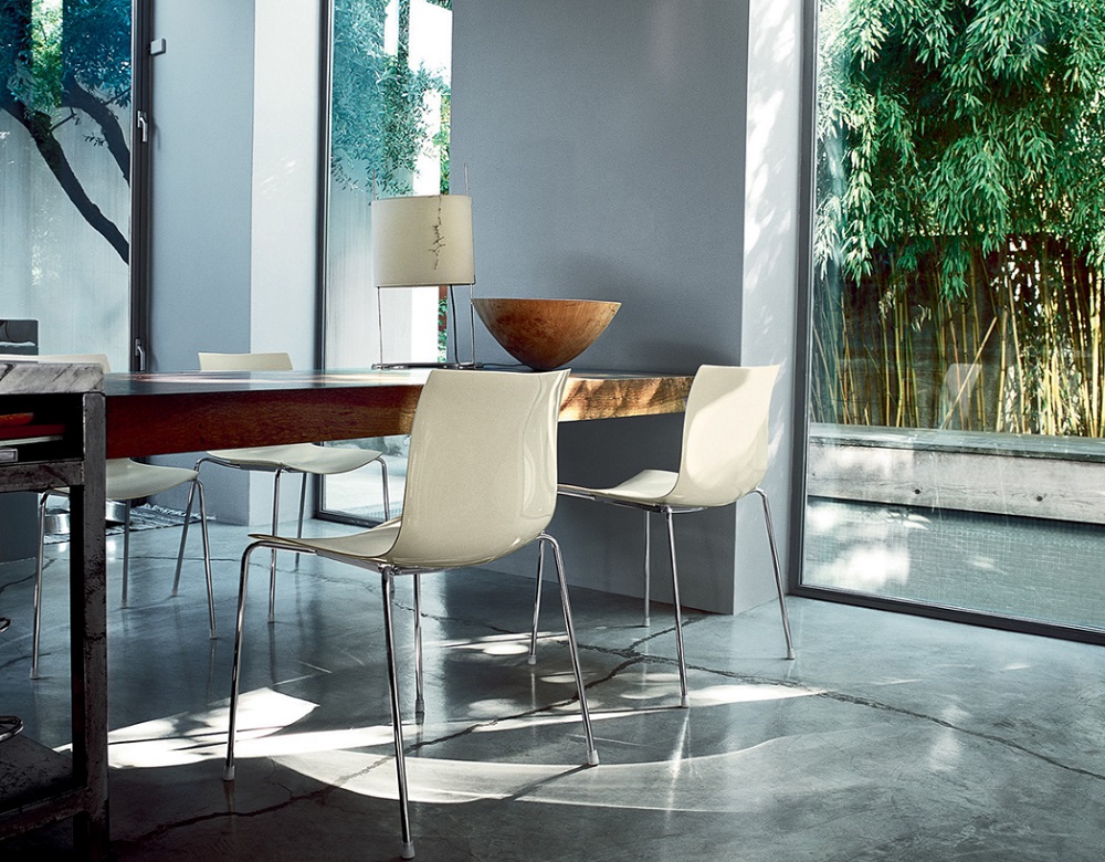 Made for both residential and contract use, indoors and out, the Catifa 46 shell and base are fabricated in a diverse range of materials, colours and finishes. The shell is constructed in double curved plywood, mono or bicolour polypropylene, covered in leather, hard leather, fabric or finished with upholstered pads. The base comes in chrome finish steel, satin finish stainless steel, aluminium, powder coated aluminium or wood, and is available in the following configurations: sled, four leg, trestle and five ways.