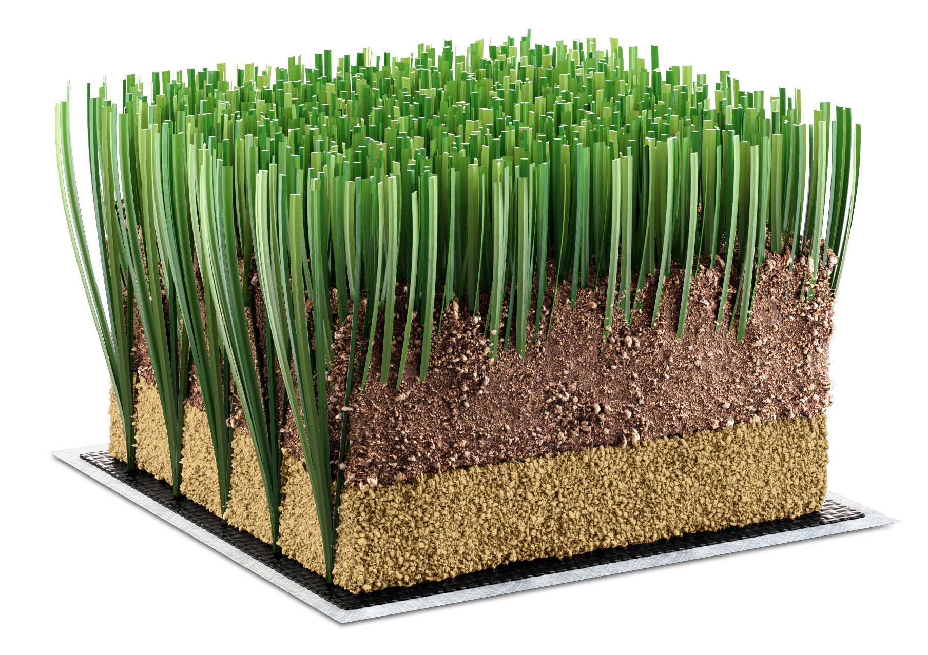 The 62 DOUBLE X PLUS ECOGREEN BIO GEO S is a sports synthetic turf system that consists of the 62 DOUBLE X PLUS ECOGREEN turf and two completion natural infills (organic sand and performance infill).