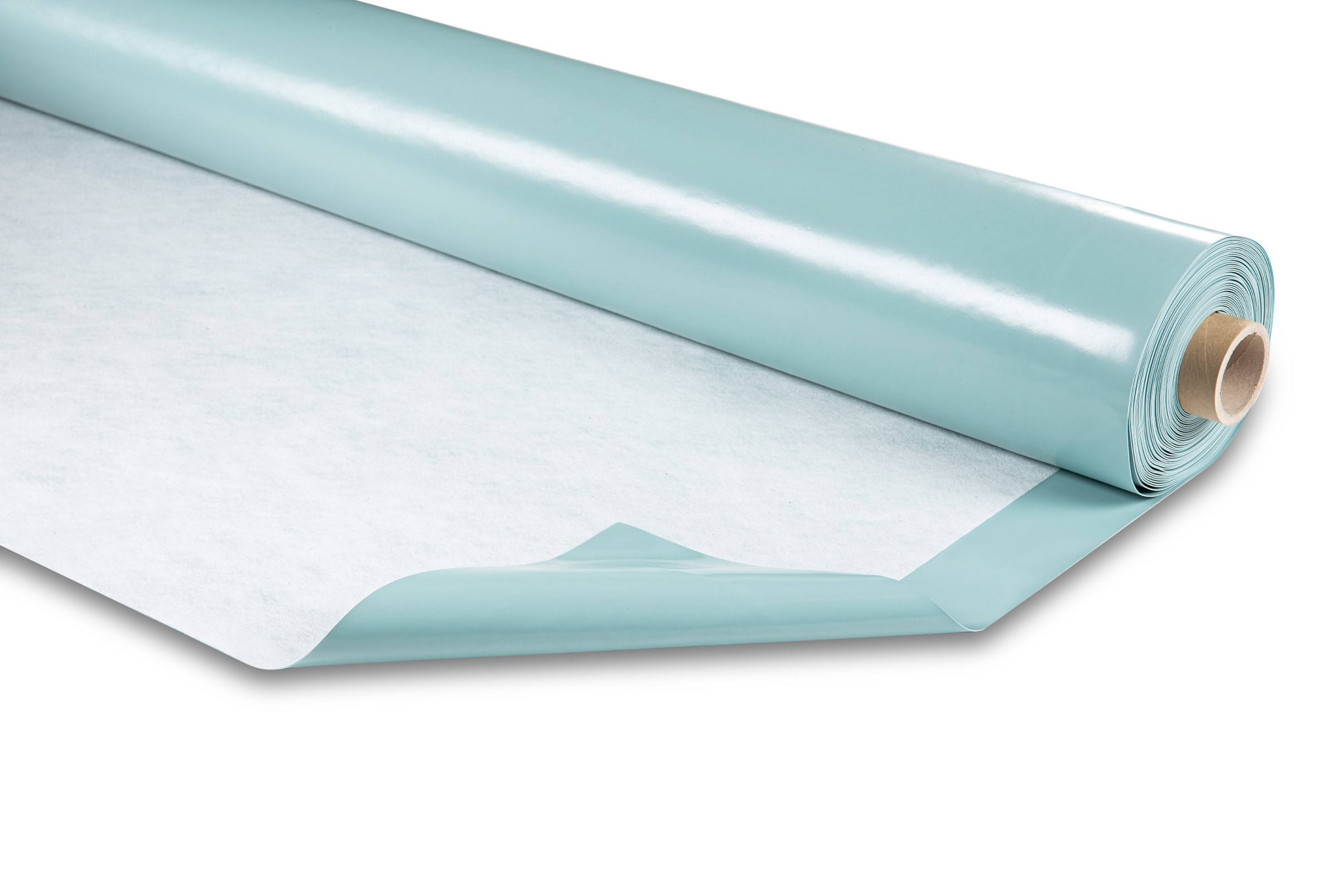 RENOLIT ALKORPRO C is a mint green geomembrane made of highly flexible PVC film heat-coupled to a non-woven polypropylene fleece.