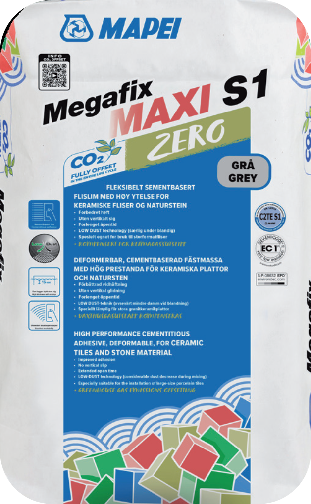 Megafix Maxi S1 Zero (grey) is a high-performance, deformable (S1) cementitious adhesive (C) with extended open time (E) and no vertical slip (T), for ceramic tiles and stone materials, with Low Dust technology and very low emissions of volatile organic compounds. Especially suitable for the installation of large-size porcelain tiles and natural stone. Classification in compliance with EN 12004.