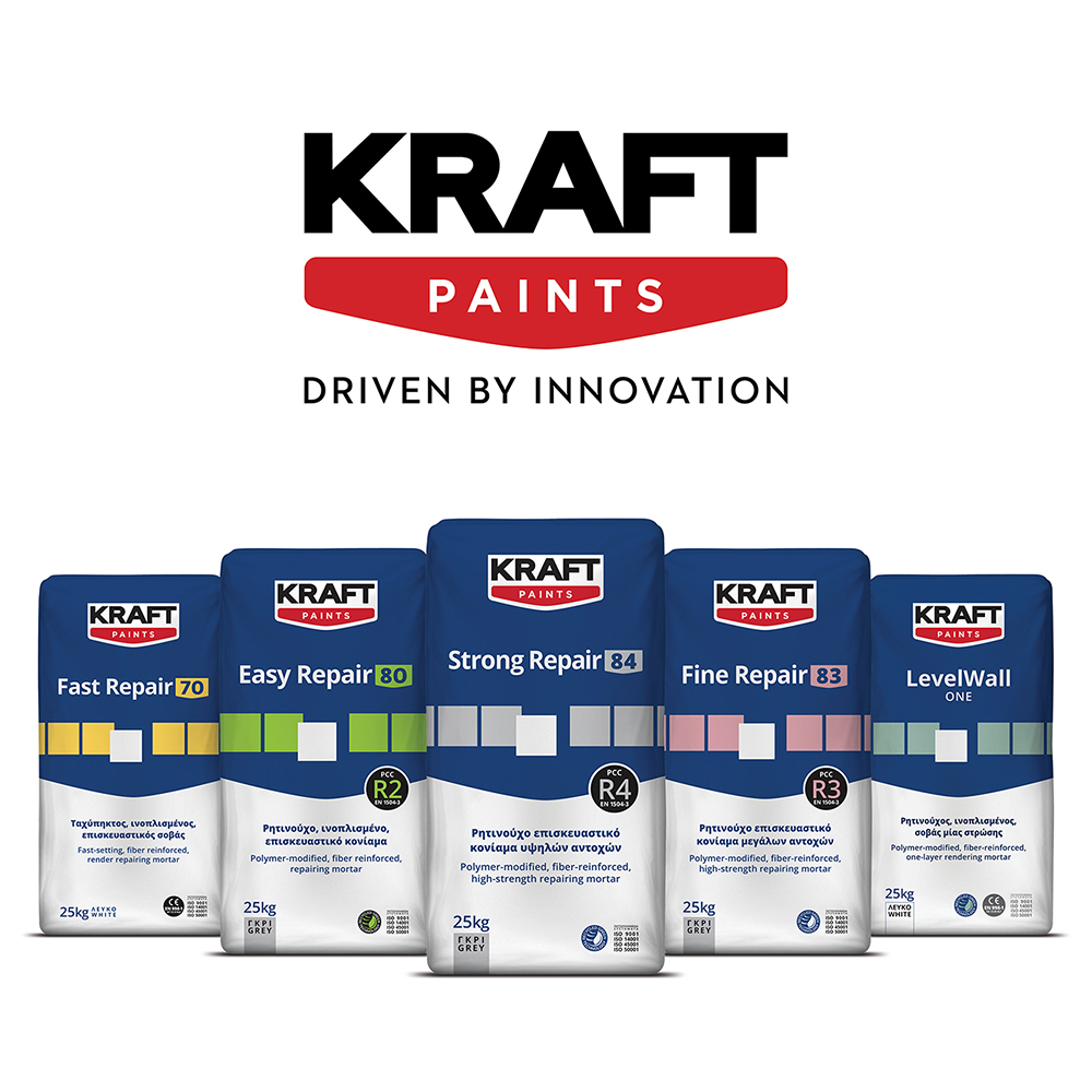 The declared multiple products are mortars that can be used for concrete repairs (structural and / or non structural) and render repairs on walls & ceilings by DRUCKFARBEN HELLAS S.A. that are marketed under the brand KRAFT Paints. They are suitable for indoor and outdoor usage.