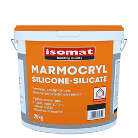 MARMOCRYL SILICONE-SILICATE Decor is used as a thin finishing coat of rendering works, to create a white or colored, water-repellent rough-textured finish. Applicable to all types of building materials like render, concrete, cement boards, gypsum boards, etc. Suitable for interior and exterior wall surfaces. It replaces the final coat of render. Thanks to its high elasticity and excellent adhesion to the substrate, it is the ideal finish coat for external thermal insulation systems, e.g. the ISOMAT THERMOSYSTEM certified thermal insulation systems.