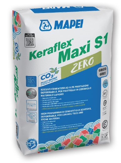 Keraflex Maxi S1 zero is a grey powder composed of cement, selected graded sand, a high rate of synthetic resins and special additives according to a formula developed in MAPEI research laboratories. When mixed with water is obtained an high performance, deformable cementitious adhesive, with extended open time and no vertical slip and with Low Dust technology.