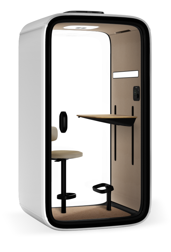 Framery One is a highly adaptable workspace for one person. The sound insulation standards and echo-free acoustics keep you free from outside noise or distractions. Ventilation speeds ensure high air quality inside the pod, keeping you fresh and focused. Adjustable lighting from the ceiling light and front-facing video conferencing light lets you set your preferred atmosphere for video meetings, focus work, or any other uses. The height-adjustable table provides a generous working space, large enough for all of your devices and any other personal items. A height-adjustable seat is available as an option. The exterior materials of the pod include powder-coated steel panels, matt-black steel and aluminium frames, and sound control laminated glass. The interior walls and roof are a sandwich element of sheet metal and recycled acoustic foam as well as PET sheets laminated in polyester. The floor is an anti-static and stain resistant low loop pile carpet.