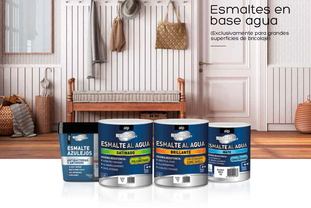 ESMALTES EN BASE AGUA (Exclusivamente grandes superficies de bricolaje): Para proteger y embellecer superficies de hierro, madera, azulejos y otras superficies.